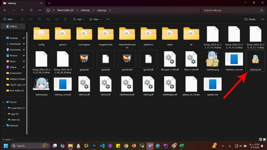 مطابق تصویر بالا، در پوشه nekoray، روی فایل اجرایی برنامه با نام nekoray.exe کلیک کنید تا برنامه باز شود.